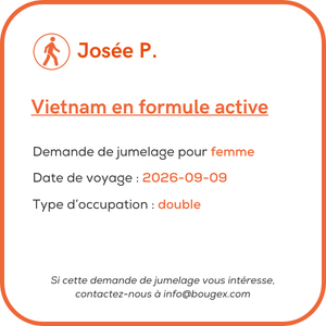 Le jumelage entre deux voyageurs est soumis à acceptation des deux parties. Dans le cas contraire, le voyageur concerné devra régler le voyage sur la base de la chambre individuelle (occupation simple) ou pourra annuler sa participation avant la date du paiement final, soit 65 jours avant la date de départ prévu. Bien que nous tentions de vous accommoder, nous ne pourrons être tenu responsable d’une situation d’incompatibilité lors de la tenue de ce voyage.