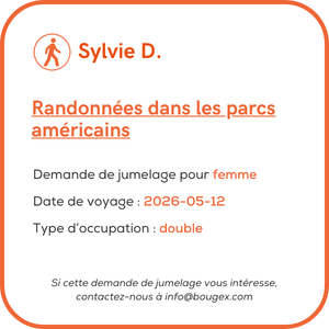L’annonce de demande de jumelage est publiée sur le site internet (sans vos coordonnées) afin qu’elle soit visible pour toute personne cherchant un partenaire de voyage.